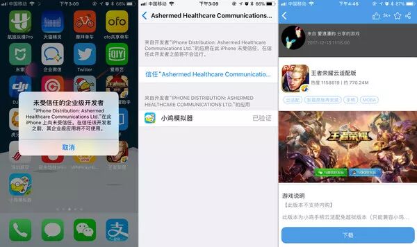 然而,连接之后还不能直接使用,因为你还需要激活游戏和手柄之间的映射。这种王者荣耀专用蓝牙无线游戏手柄用的是云适配方法,也就是你需要删掉原本的游戏,然后下载所谓的云适配版本。由于他们提供的云适配版本是没有通过苹果审核的,不能在App store内直接安装,需要跟着他们提供的方法下载。