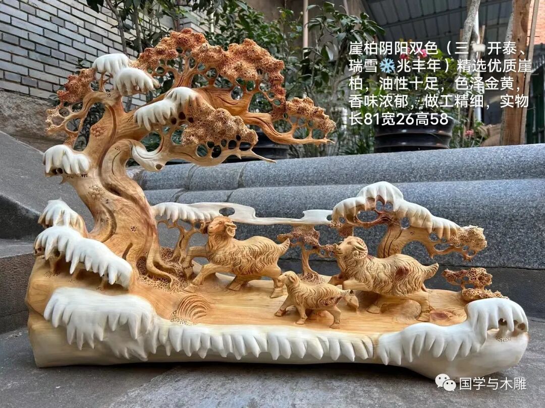 今天请您欣赏木雕作品:瑞雪兆丰年,三羊开泰。材质崖柏,全手工打造,非常适合过年摆,寓意好!