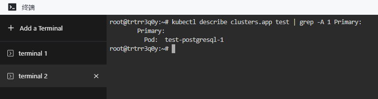 同时我们查看一下当前的主节点是哪个,发现是 test-postgresql-1: