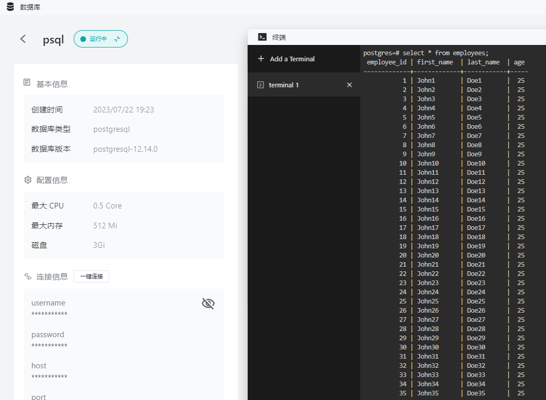 创建完成后便可通过一键连接功能进入到数据库命令终端: