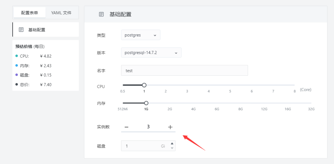 首先创建一个实例数大于 1 的数据库应用,这里我们创建一个 3 实例的 PostGreSQL: