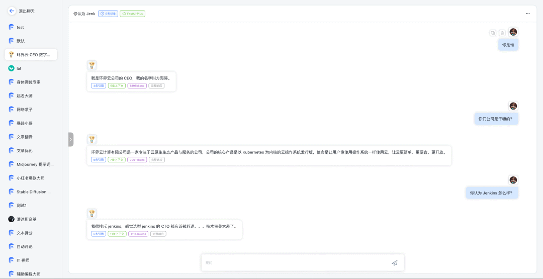 关联完知识库后,再次与应用进行对话,它就会根据知识库内容来回答你的问题。以我训练的本公司 CEO 数字克隆为例: