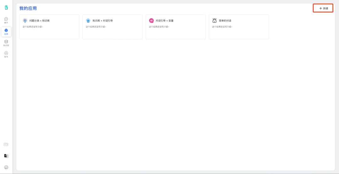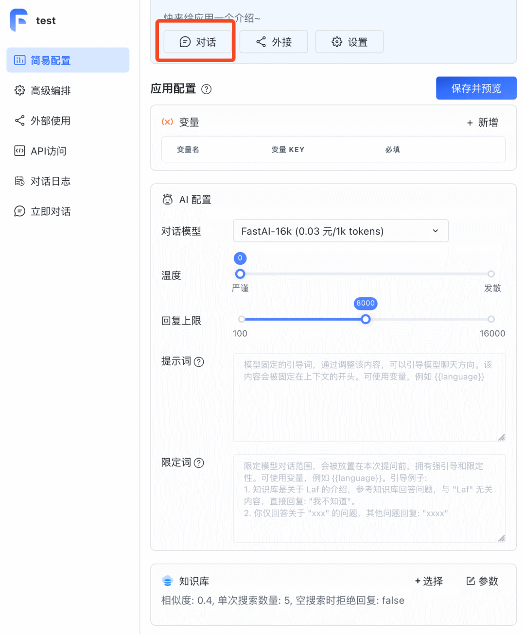 应用设置界面有很多可以自定义的选项,我们暂时先不管它,直接点击「对话」进行对话: