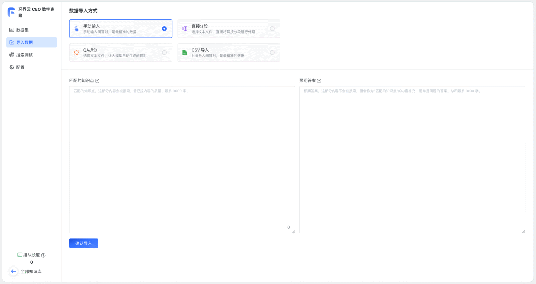 FastGPT 提供了手动输入、直接分段、LLM 自动处理和 CSV 等多种数据导入途径,其中“直接分段”支持通过 PDF、WORD、Markdown 和 CSV 文档内容作为上下文。FastGPT 会自动对文本数据进行预处理、向量化和 QA 分割,节省手动训练时间,提升效能。