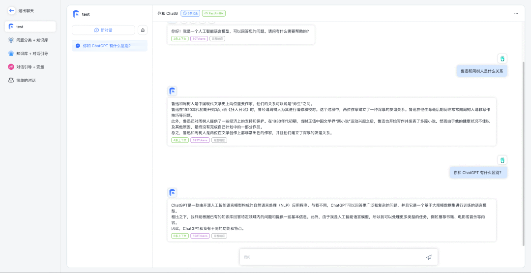然后就可以在 FastGPT 中和 Llama2 中文大模型进行对话啦~