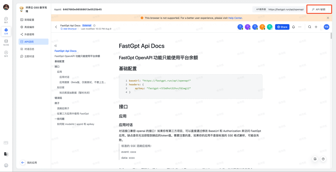 利用刚复制的 API 秘钥加上 AppId 组合成一个新的秘钥,格式为:API 秘钥-AppId,例如这里的组合密钥就是:fastgpt-z51pkjqm9nrk03a1rx2funoy-6467660e98568613e0525b45。