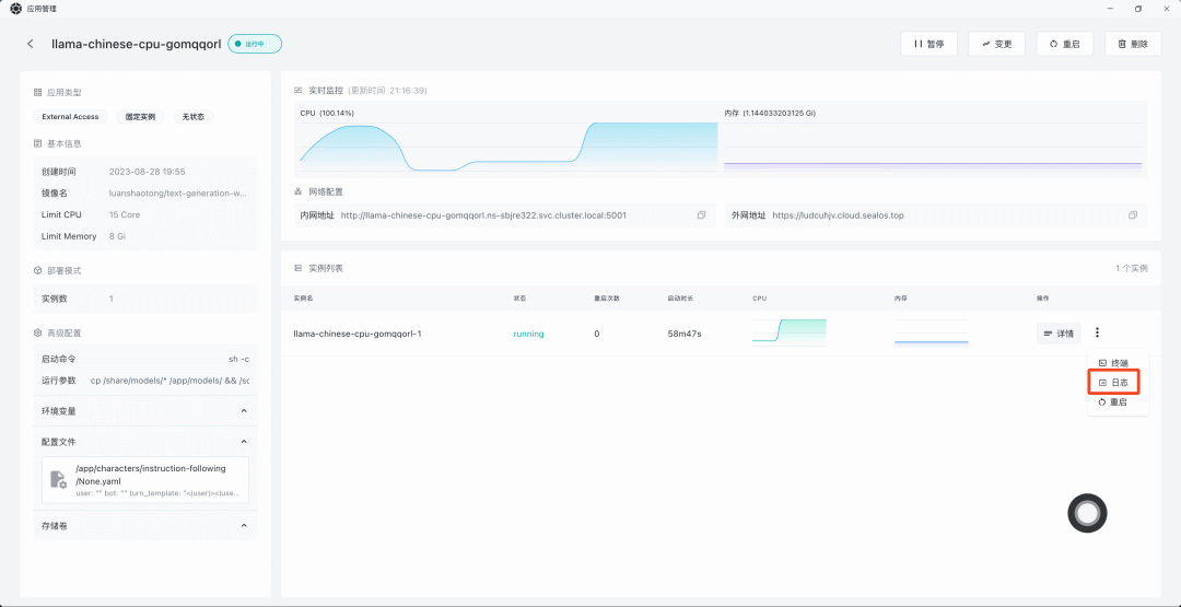 但大部分国内用户的需求还是要保证线路稳定,使用海外集群就有点力不从心了。为了满足国内用户的需求,如今我们正式上线了国内集群(https://cloud.sealos.top),与海外集群功能一致。除此之外,国内集群还新增了一项功能:通过共享存储来加载主流的大模型文件(目前只加载了 LLama2 中文模型)。