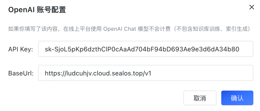 API Key 的值随便填,BaseUrl 的值填入之前在应用详情页面复制的外网地址,并在结尾加上路径 v1,并点击「确认」: