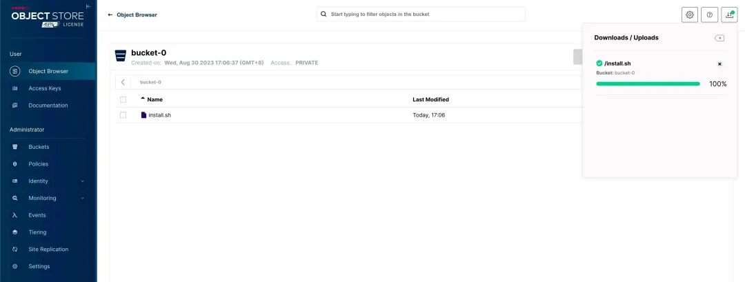 输入账号密码,开始使用 MinIO。简单创建一个 bucket 存储桶,然后上传 install.sh 文件。