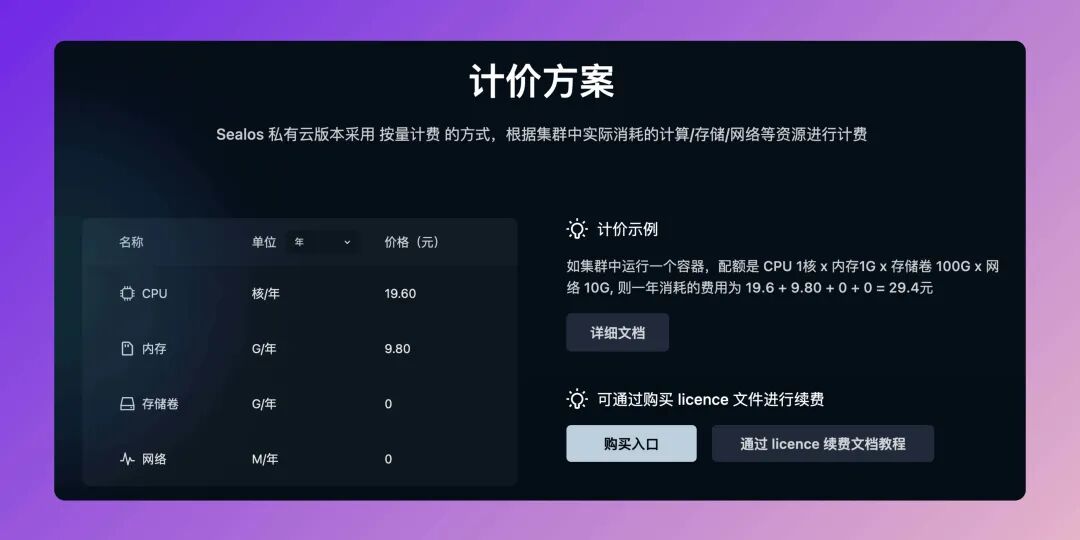 Sealos 授权费用: 元(这里是按照集群用满的情况来计算的,实际授权费用会根据实际分配和使用的计算资源来进行计费)。