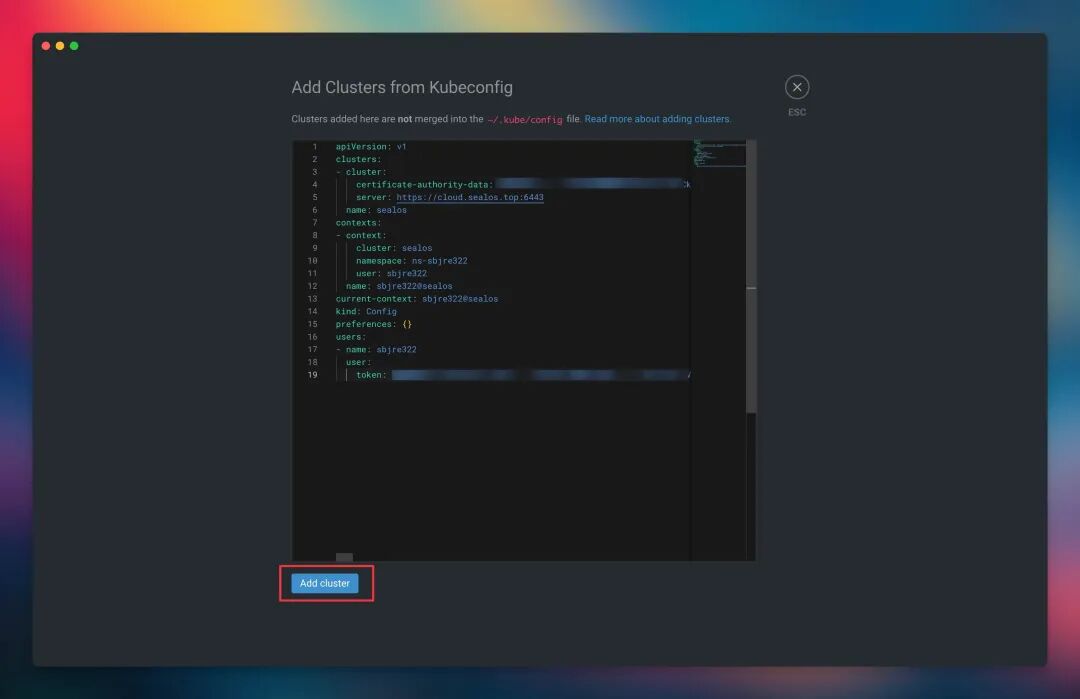 然后将之前复制的 kubeconfig 内容粘贴到输入框,并点击 “Add cluster”: