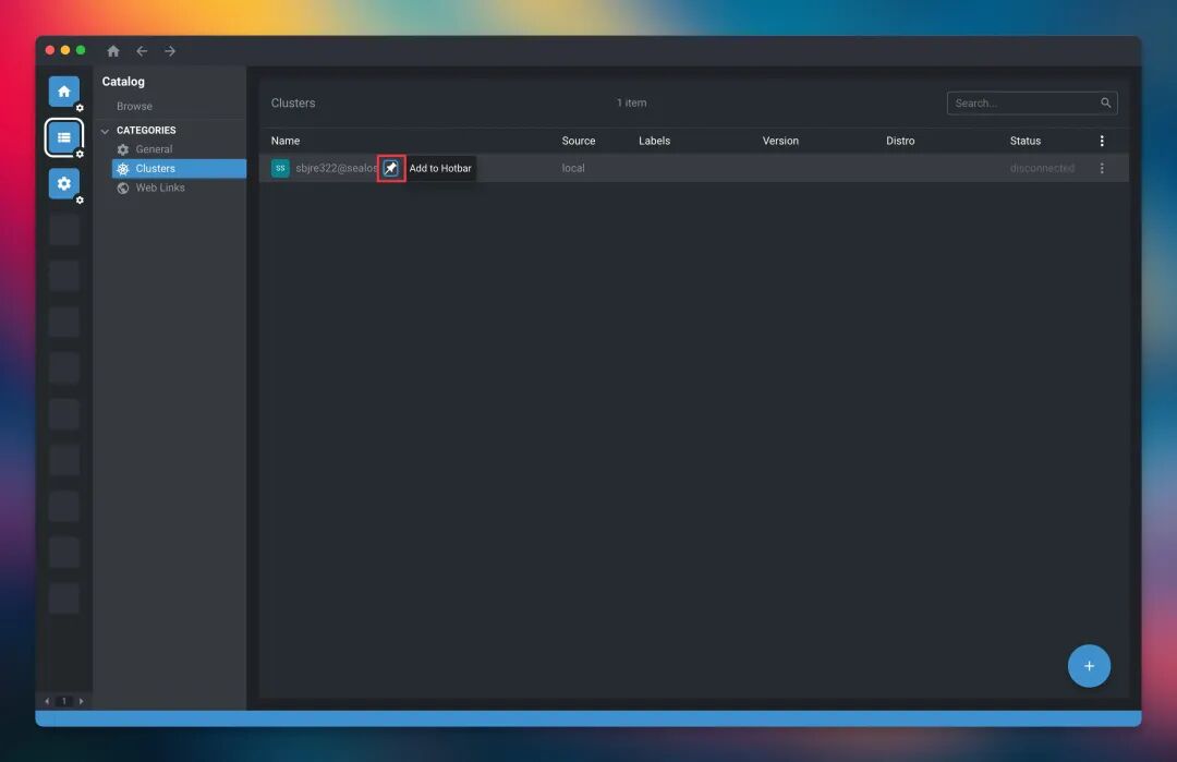 点击 “Add to Hotbar” 图标,这个集群就会被固定到左边的侧栏:
