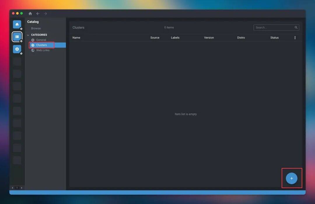 安装完成后,打开 OpenLens,进入 Catalog 的 Clusters 选项,然后将鼠标悬停在右下角的 “+” 上: