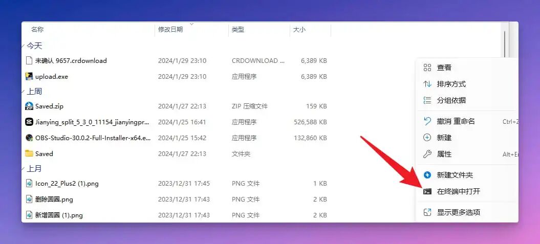 找到下载好的文件所在的文件夹,右键空白区域打开命令提示符(或 Powershell 以及其他终端)。