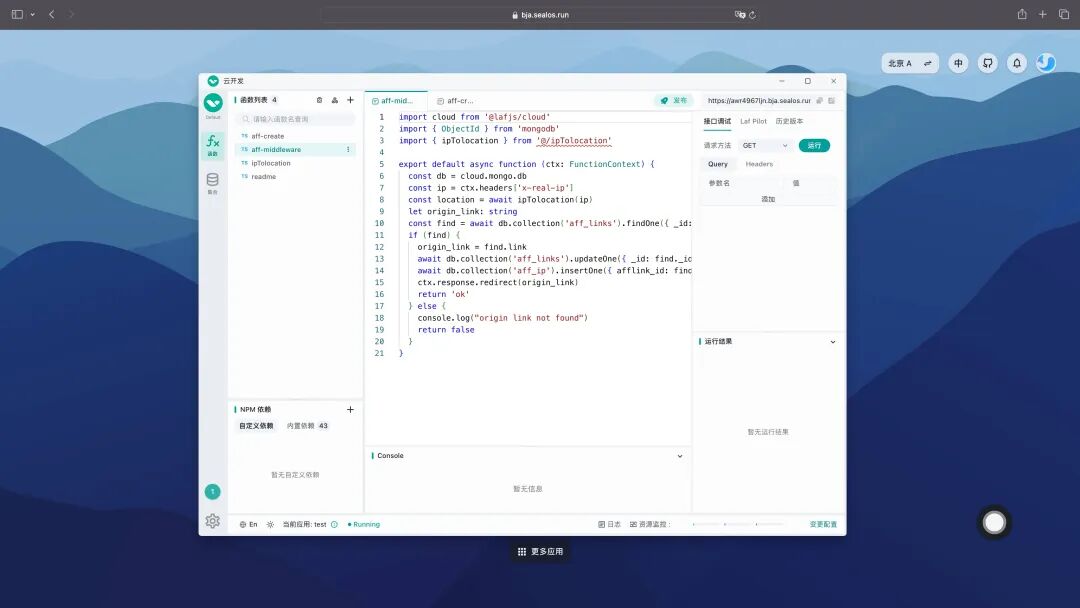 我们基于 Sealos API 实现的杀手级应用:Sealos 云开发,提供了开箱即用的云函数、云数据库、对象存储、在线 WebIDE 等能力,让用户可以像写博客一样写代码,快速开发、毫秒级发布。