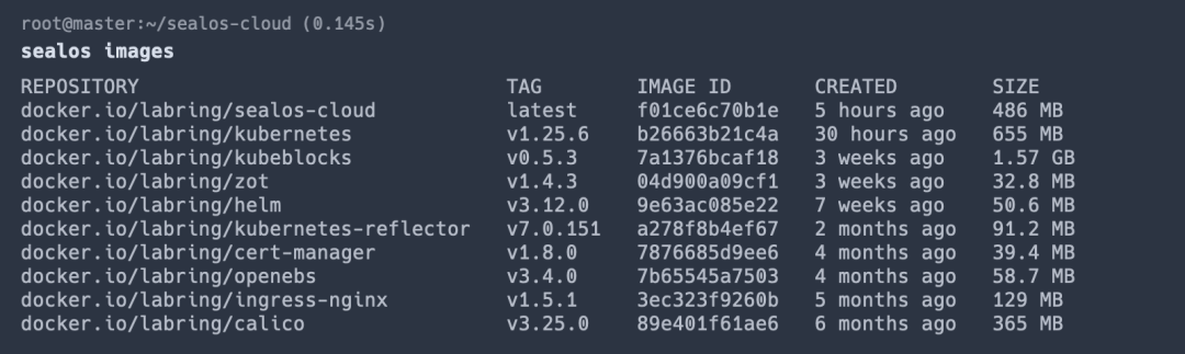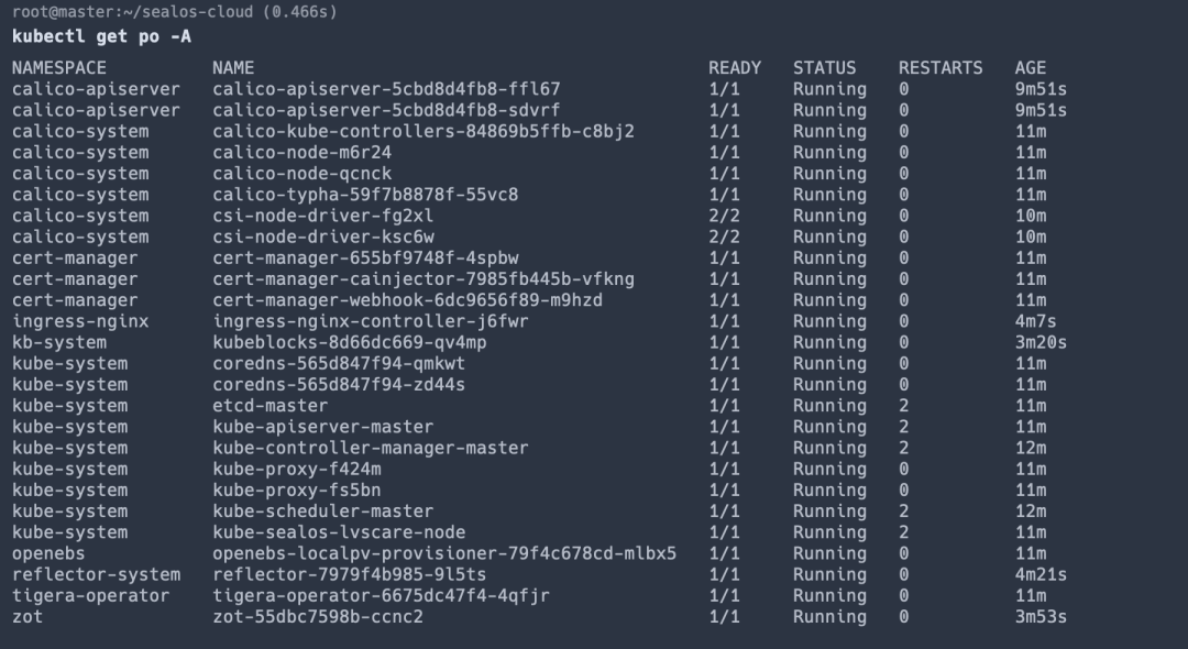 # 注意:helm 版本需要在 3.12.0 及以上!$ sealos gen labring/kubernetes:v1.25.6 \ labring/helm:v3.12.0 \ labring/calico:v3.24.1 \ labring/cert-manager:v1.8.0 \ labring/openebs:v3.4.0 \ --masters 10.140.0.16 \ --nodes 10.140.0.54 > Clusterfile# 请修改 Clusterfile 中的 PodSubnet 及 ServiceSubnet# 默认的 PodSubnet: 100.64.0.0/10# 默认的 ServiceSubnet: 10.96.0.0/22$ sealos apply -f Clusterfile