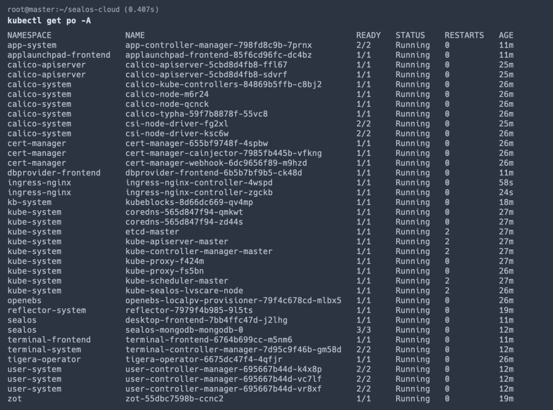 等待所有 Pod 均为 Ready 状态后,即可访问 Sealos,最终集群 Pod 如下: