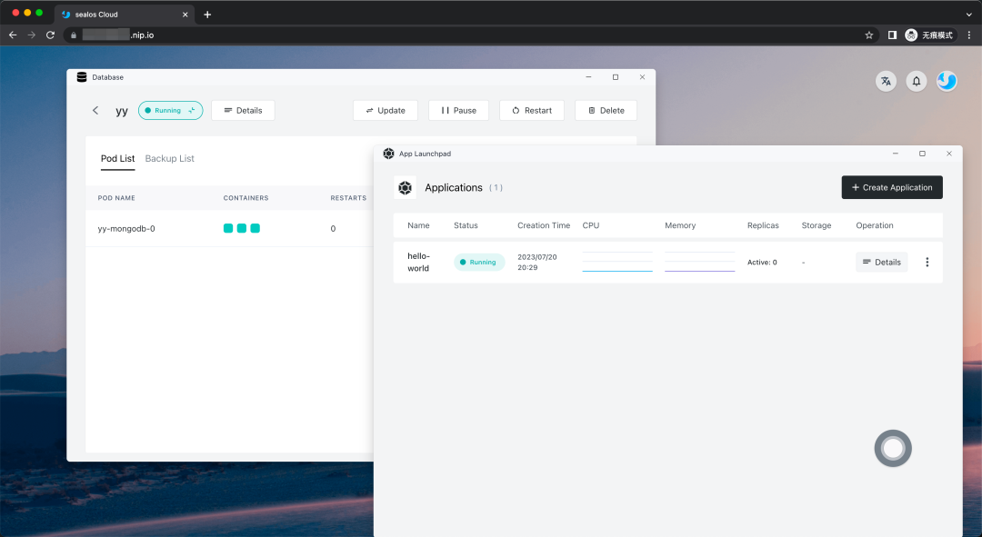 $ sealos run docker.io/labring/sealos-cloud:latest\ --env cloudDomain="34.81.60.57.nip.io"