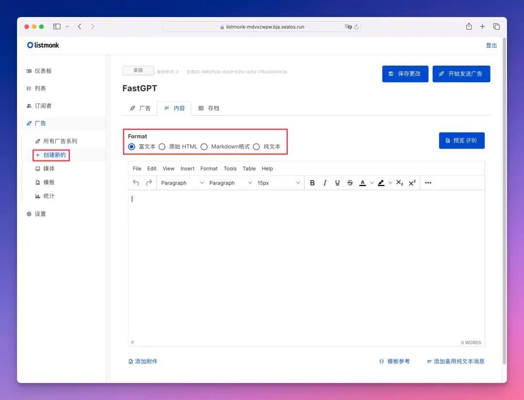 有了订阅者列表后,你就可以创建电子邮件活动了。点击 “广告” 标签,然后点击 “创建新的”。listmonk 支持富文本、HTML、Markdown 等多种文本编辑格式,你可以选择自己擅长的格式来编辑邮件的正文内容。