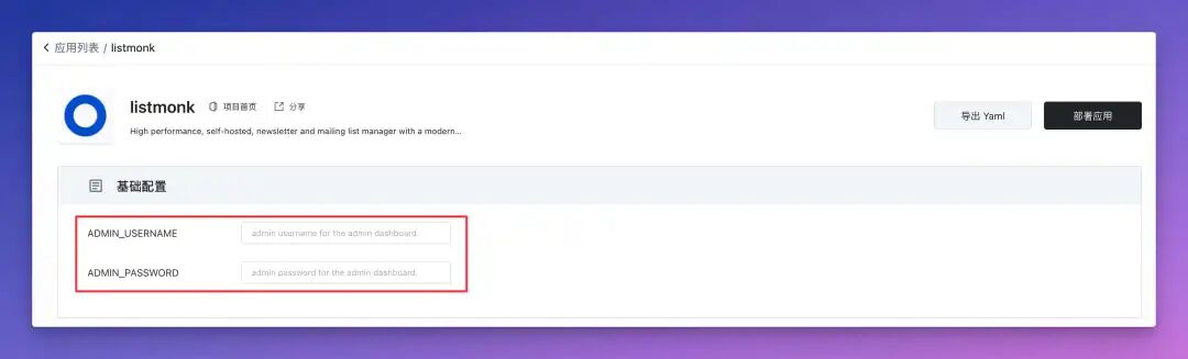 跳转进来之后,你会看到有两个变量,分别是 WebUI 的管理员用户名和密码,如果不设置,任何人通过域名都可以直接访问你的 listmonk WebUI,建议还是设置一下。