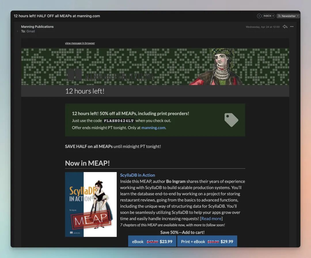 做产品肯定要做电子邮件营销,特别是面向海外的产品,电子邮件营销已成为企业与客户沟通、建立品牌忠诚度和推动销售的重要工具,可以直接接触到目标受众,提供个性化内容,并以相对较低的成本获得可观的投资回报。你看,MEAP 又来提醒我买电子书了!
