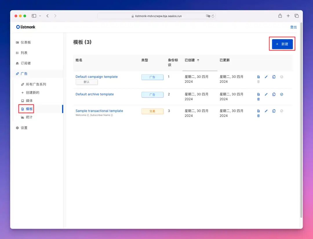 一般情况下,我们可以先预设一个模板。你可以在 listmonk 中上传或者创建一个新的模板:
