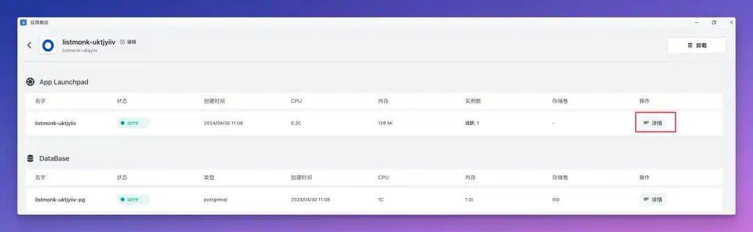 如果数据库已经准备就绪,那么回到原来的应用商店界面,直接点击应用的 “详情” 进入该应用的详情页面。