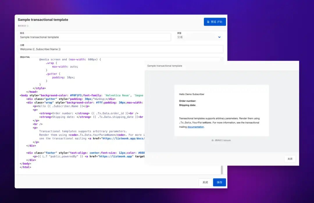 模板编辑器支持各种内容块,如文本、图像、按钮等。你可以根据需要自定义其内容。listmonk 还支持个性化标签,如 {{ .Campaign.Subject }}。这些标签会在发送时自动替换为订阅者的具体信息,创造个性化的体验。