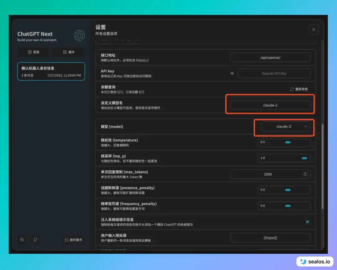 默认是 gpt-3.5-turbo 模型,我们可以添加自定义模型 claude-2,然后就可以在「模型」里选择 claude-2 模型了。