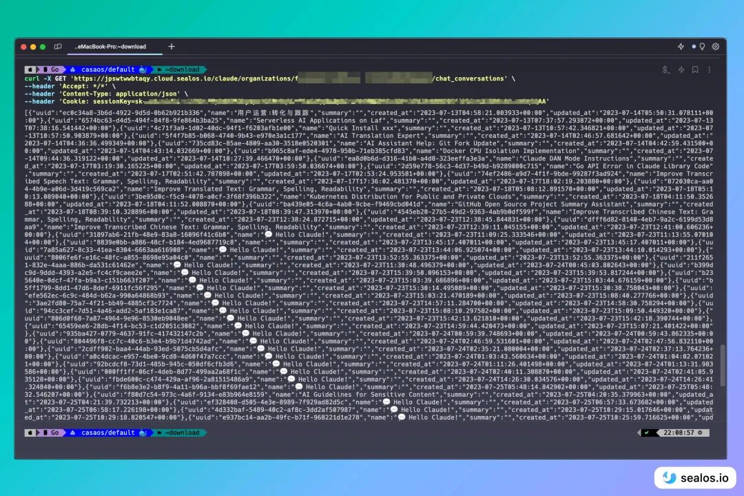 $ curl -X GET '<PROXY_URL>/claude/organizations/<organization_uuid>/chat_conversations' \--header 'Accept: */*' \--header 'Content-Type: application/json' \--header 'Cookie: sessionKey=<KEY>'