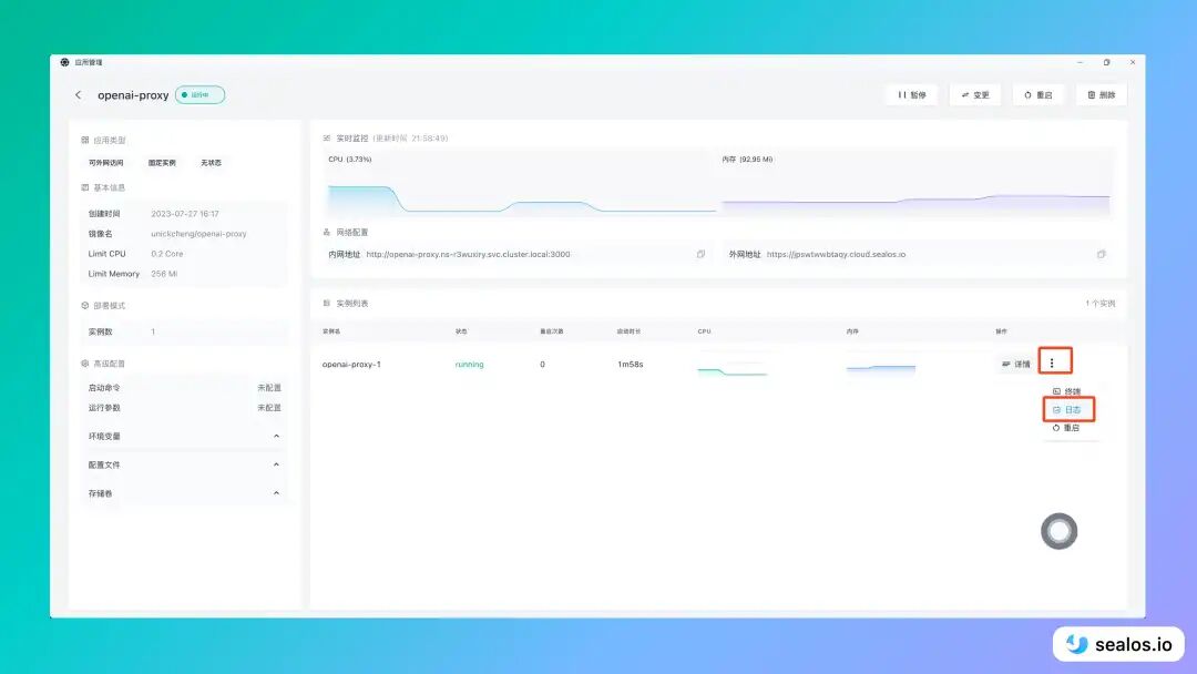 可以看到 openai-proxy 应用的运行情况,包括 CPU 占用、内存占用等。依次点击右边的三个点,再点击「日志」,即可查看容器日志:
