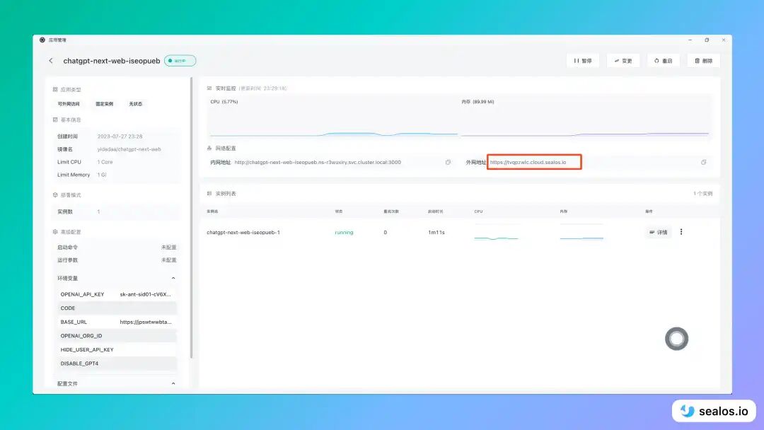 然后直接点击「部署应用」,部署成功后跳转到应用详情页即可查看部署情况。