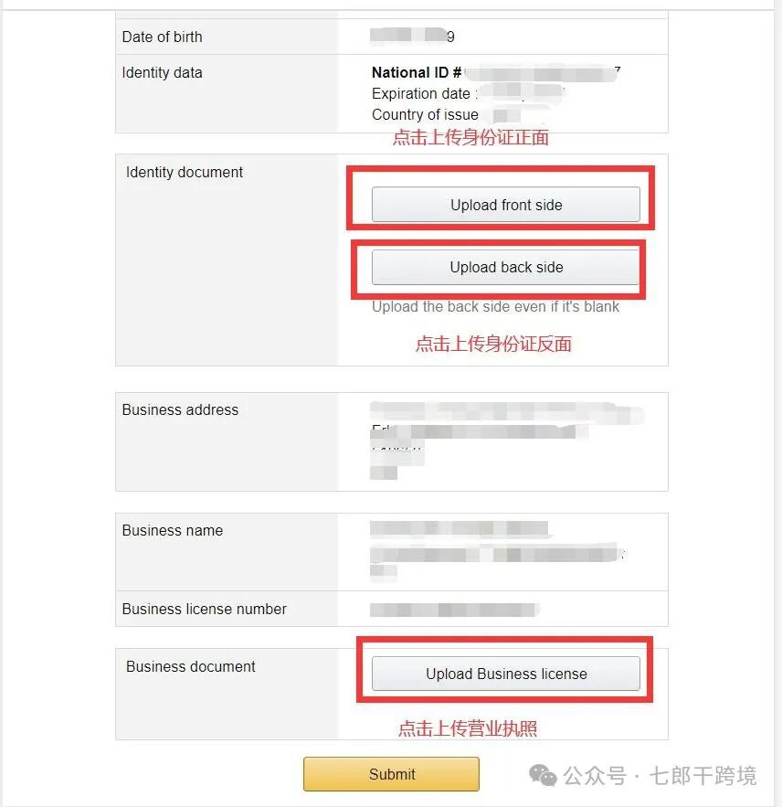 上传营业执照照片,身份证正反面,提交信息即可完成注册