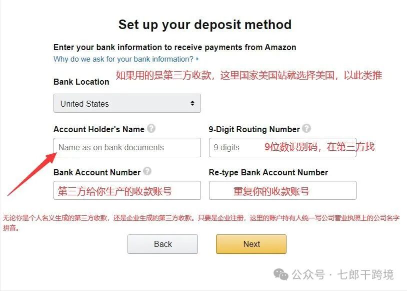 填写收款账号,如果是使用第三方收款,比如pingpong ,这里的国家需要选择对应站点国家,相关信息可以直接问你的第三方收款客服人员