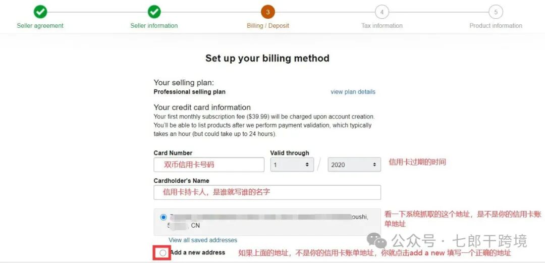 填写信用卡信息,信用卡过期时间,持卡人名字,信用卡账单地址。信用卡可以不是法人的,别人的卡也行,只要没在亚马逊用过