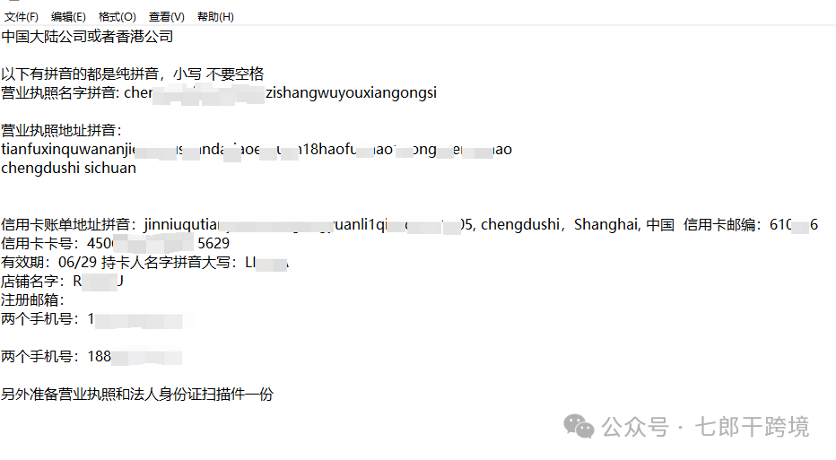 编辑以上项目为可填写的资料,比如营业执照上的公司名称,地址,法人名,办公地址等等。书写格式参考下图,花费500远程开店,最有价值的内容。