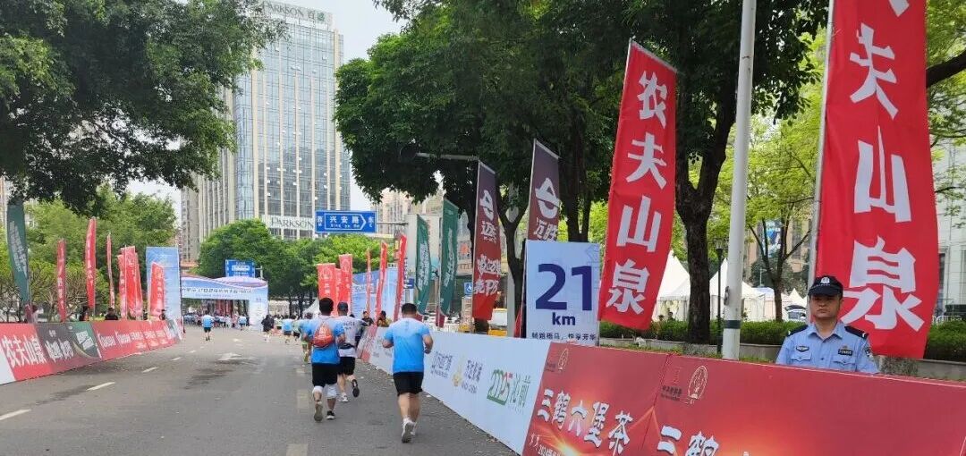 每隔两三公里,有提供水、能量饮料、水果、面包的补给站,很多跑者都会在补给站迅速喝点水再继续跑。
