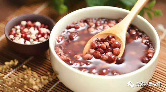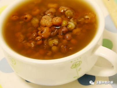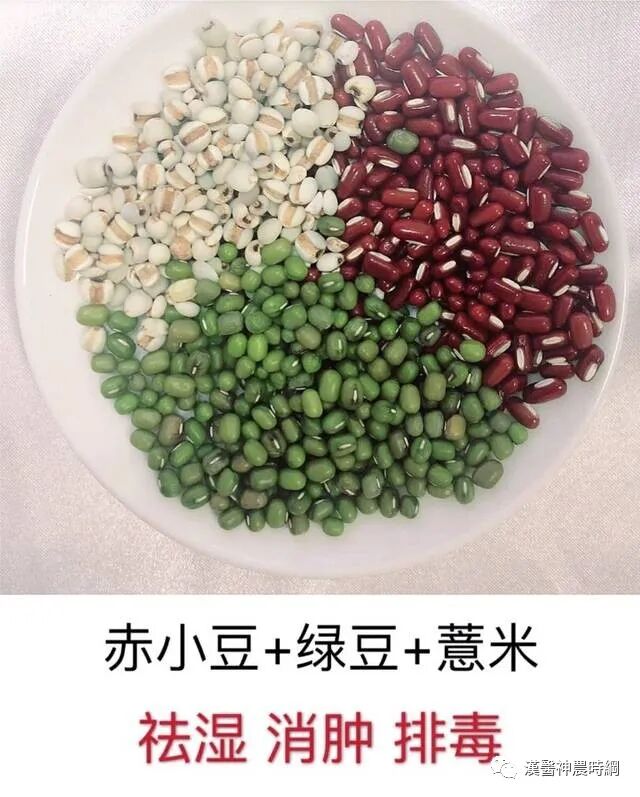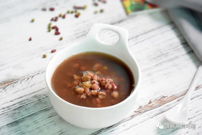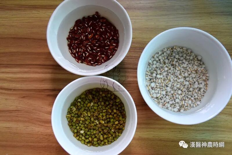 将绿豆、薏仁、赤豆等量混合在一起,一份“三豆”加三份水,小火煮烂,每日食用 1~2 次,每次 1 碗。