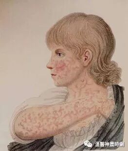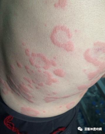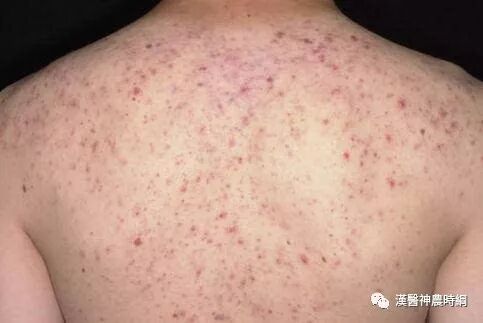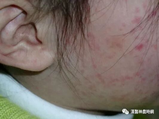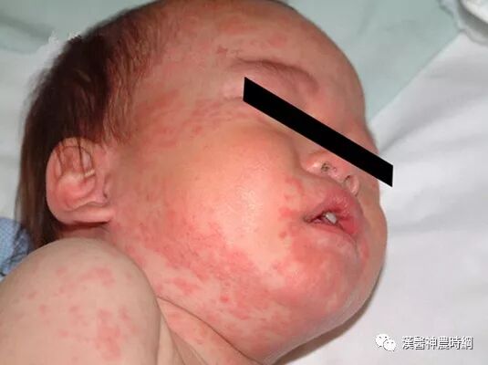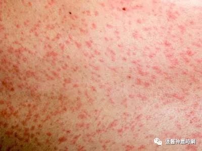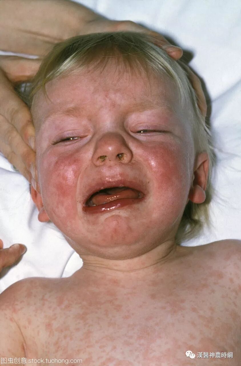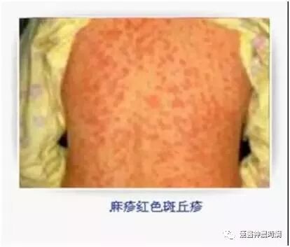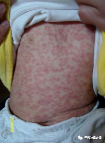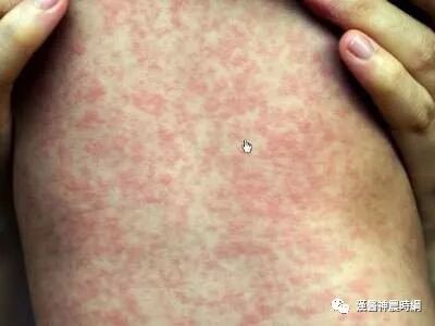 3、出疹期 多在发热后3~4天出现皮疹。体温可突然升高至40~40.5℃,皮疹开始为稀疏不规则的红色斑丘疹,疹间皮肤正常,始见于耳后、颈部、沿着发际边缘,24小时内向下发展,遍及面部、躯干及上肢,第3天皮疹累及下肢及足部,病情严重者皮疹常融合,皮肤水肿,面部浮肿变形。大部分皮疹压之褪色,但亦有出现瘀点者。全身有淋巴结肿大和脾肿大,并持续几周,肠系膜淋巴结肿可引起腹痛、腹泻和呕吐。阑尾粘膜的麻疹病理改变可引起阑尾炎症状。疾病极期特别是高热时常有谵妄、激惹及嗜睡状态,多为一过性,热退后消失,与以后中枢神经系统合并症无关。此期肺部有湿性罗音,X线检查可见肺纹理增多。