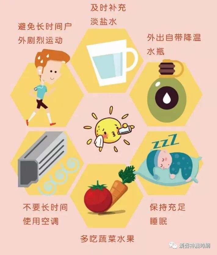 此外,在日常生活的饮食中,多吃些西瓜、黄瓜、西红柿及桃杏等蔬菜水果也有预防中暑的作用。