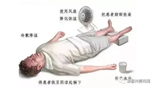 包括物理降温。物理降温,可用冷水浇身,头颈部放置冰袋,冰盐水灌肠或让病人站在冷水中,亦可用酒精擦拭体表,促进散热。药物降温,可用氯丙嗪1~2毫克/公斤体重,肌肉注射或混于5%糖盐水中静脉注射。