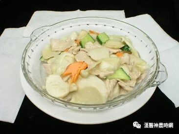 【制法】:将猴头菇去蒂,洗净,人沸水锅中焯一下捞出,挤干水,批成薄片,放人碗内,加鸡蛋清、精盐、湿淀粉,搅拌均匀,然后将猴头菇片逐一放人沸水锅中氽熟捞出。炒锅用中火,加熟猪油烧热,投入葱段炸香,加入料酒、水发玉兰片、青豆、酱油、姜汁、精盐、鸡汤、猴头菇片、火腿片,焖至汤稠时加味精,用湿淀粉勾芡,淋入熟猪油,出锅装盘即可。