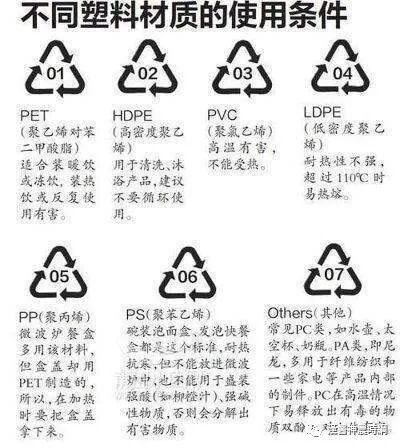 1、“1号”PETE:矿泉水瓶、碳酸饮料瓶、饮料瓶别循环使用装热水。使用:耐热至70℃,只适合装暖饮或冻饮,装高温液体、或加热则易变形,有对人体有害的物质融出。并且,科学家发现,1号塑料品用了10个月后,可能释放出致癌物DEHP,对睾丸具有毒性。