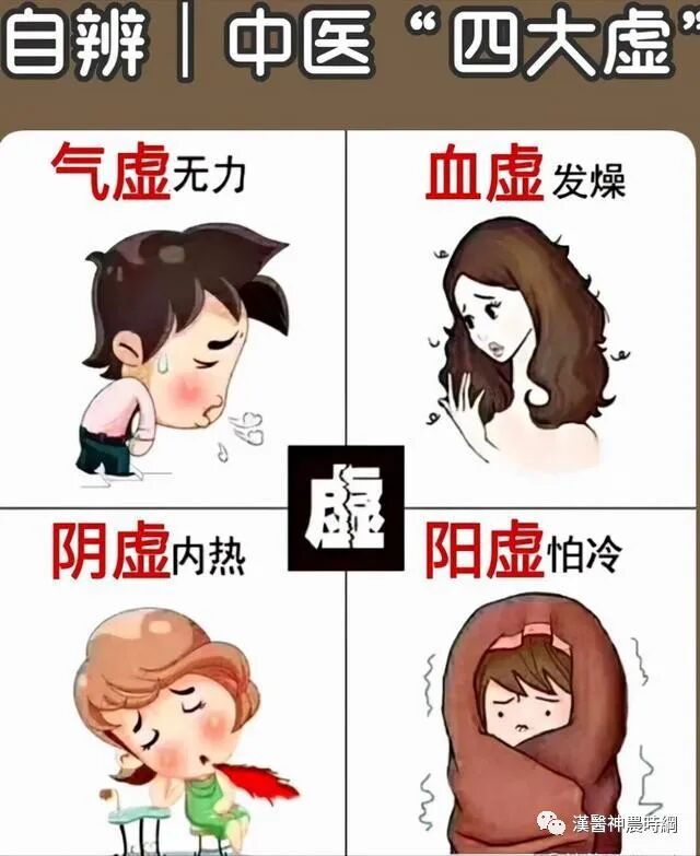 气虚无力、血虚发燥、阴虚发热、阳虚怕冷