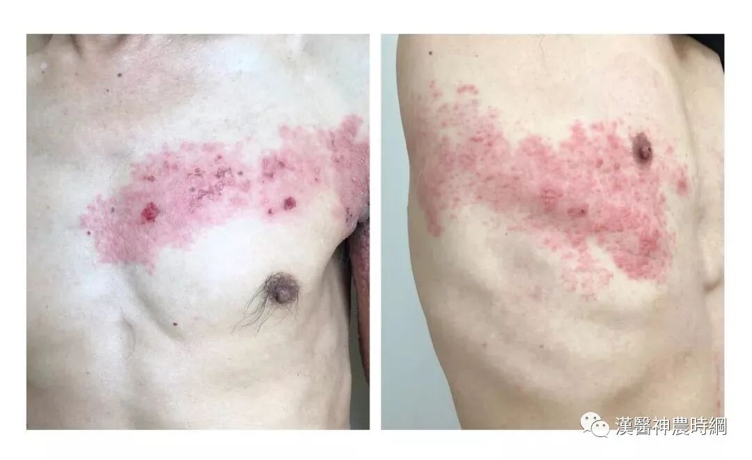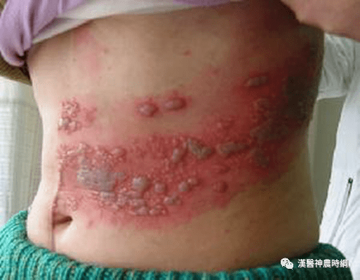 疱疹分布多位于一侧,非列成带状,有时偶可超过躯干中线,这是由于神经末梢横过中线所致。胸、颈及面部三叉神经分布区为好发部位。通常三叉神经只累及一根分支。局部淋巴结常肿大疼痛。神经痛是本病的主要症状,急性期是由于神经节的炎症反应,晚期神经痛是由于神经节以及感觉神经的炎症后纤维化引起的。有时在疱疹出现前有剧烈的神经痛,此时常易误诊为急腹症或心绞痛等。老年体弱或淋巴瘤患者常有神经痛后遗症,有时可持续数月。
