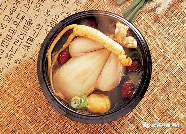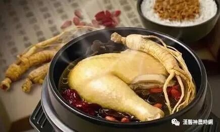 5、人参炖鸡。野山参(鲜)一支30克左右,加黄芪(干)30克左右,把参和黄芪放在鸡肚里,把鸡放在瓷盆里封好后,放在水里慢火煮之,鸡脱骨后,每天早晚食之,约7天吃完。