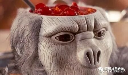 一只非常可爱的猴子被牵出,据说那是专门食用的猴儿,头比较大,猴的头顶从小洞中伸出,把猴子的头用金属箍住,并且箍的非常紧,用小锤轻轻一敲,头盖骨应声而落,猴子的脑部就完全裸露在食客们的面前,用汤勺伸向红白相间的猴脑。
