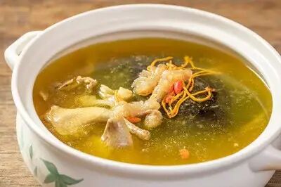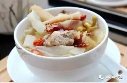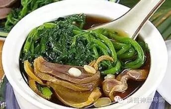即是一道汤得以扬名是因为喝进了名人的口,而且多以皇帝首尝此汤。苏州菜中的八宝豆腐羹是沾了康熙的光;荆州的翡翠白玉汤是乾隆喝的第一口,其材料也不外是豆腐加菠菜;潮州的护国菜则是在南宋最后一个皇帝逃难于庙中,僧人用番薯叶煮成汤肴送于少帝所喝。其六谓小家碧玉型,是日常喝的汤水,这种汤的好处是费时不多,且材料任你发挥,方便得如吃速食面一般。常见的有紫菜蛋花虾米汤、鱼头豆腐汤、菠菜猪肝汤、蘑菇肉片汤等。