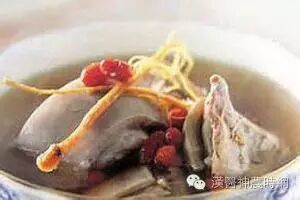 材料:冬虫草25克,水鸭1只,无花果2粒,陈皮1/4片,姜2片做法:冬虫草洗净,水鸭洗干净,放入滚水内煮5分钟,取出。陈皮净软刮去囊。水煲滚,将冬虫草、水鸭、无花果、陈皮、姜加入煲滚,改文火煲两个半小时,加盐调味。功效:补中益气,食欲不振,肾虚哮喘。