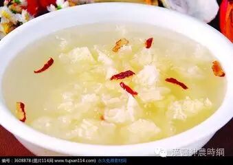 [做法]水发银耳摘去蒂头,拣去杂质,漂洗洁净,加水适量,急火煮沸改用文火煮熟,至银耳酥烂,加入冰糖,搅拌至溶化。鸡蛋取蛋清加少许水搅匀后入锅中,再以文火令沸,出锅前加入熟猪油少许即成。